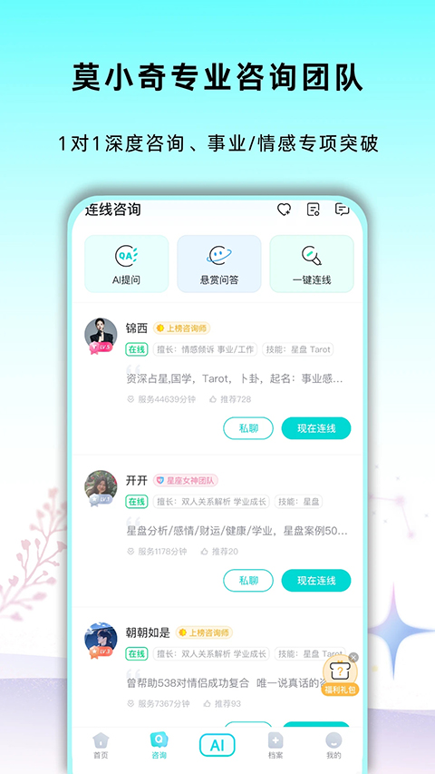 准了app是一款非常有趣好玩的预言占卜软件,由北京星座女神文化传媒有限公司精心打造而成。该软件集实用与专业于一身,提供职业占星师、星座合盘预测、星盘预测、专业星盘工具、运势文章等服务,为你解读健康、运势、爱情、工作、生活、事业、财富等多个方面的预测,为星座爱好者提供星座运势占卜服务,星座爱好者绝对不可不看。除此之外,软件界面清爽简约,操作方便易用,拥有多套星盘设置切换,可备注盘主信息,筛查星盘配置,恒星、中点、纬照信息随意查看。同时还会为你建立档案袋,进行档案分组,多种星盘可选,参数一目了然,档案独立管理,界面随心调整,更多诸多神秘学工具即将发布,拭目以待。