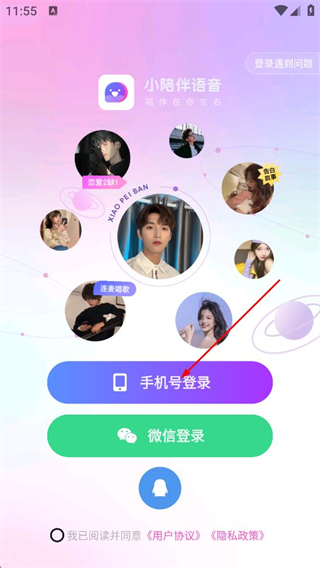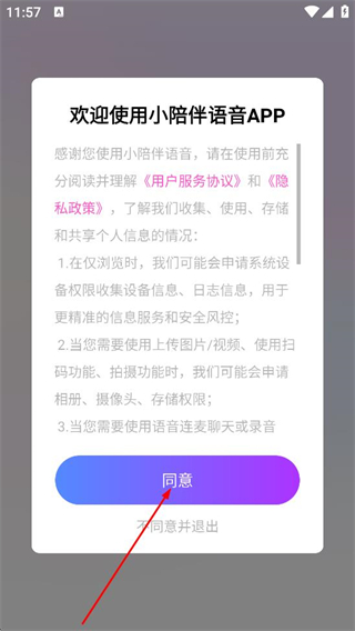 1、在欢迎使用小陪伴语音APP弹窗中,点击同意,进入登录选择页面。