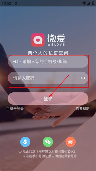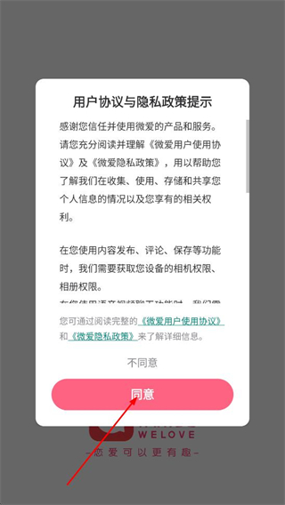 1、在微爱的用户协议与隐私政策提示弹窗中,点击同意,进入登录页面。