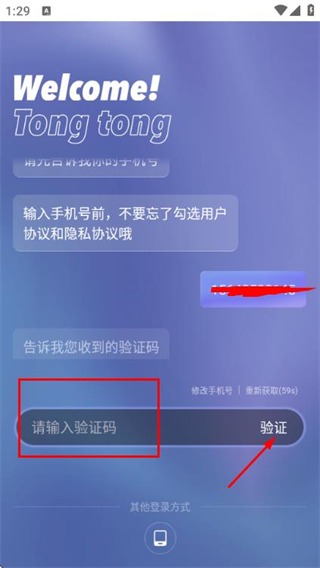 3、在验证码输入框中填写收到的验证码,点击验证完成账号的登录操作。