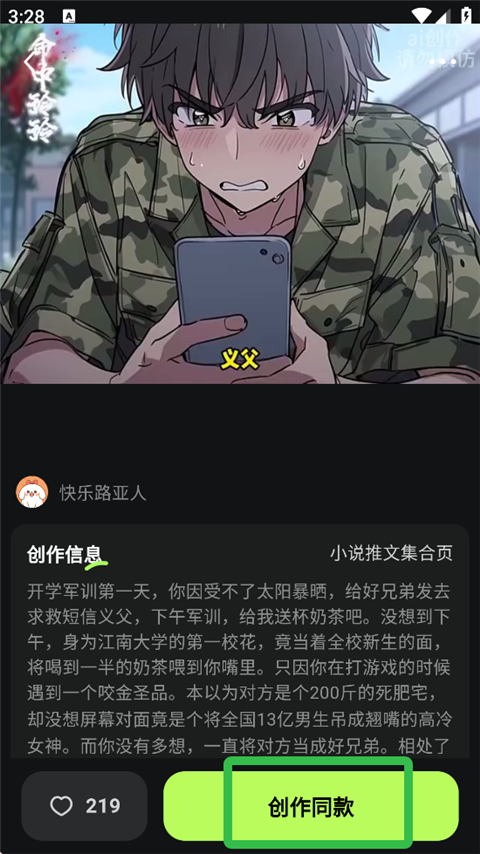 4、点进详情页,点击【创作同款】,输入自己故事内容即可套用模版生成视频。