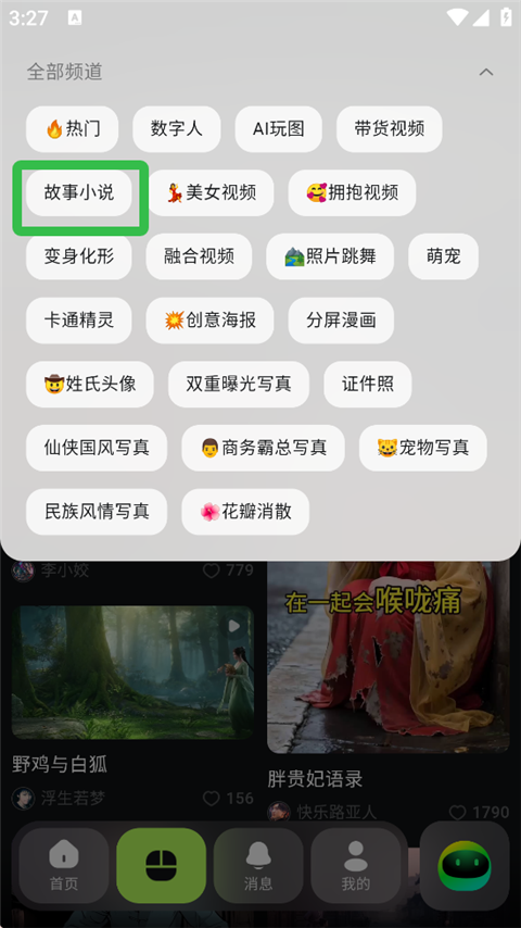 2、然后选择【故事小说】频道。