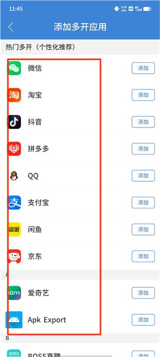 - 微信分身:点击“添加”按钮→跳转到应用列表页→点击想要分身的APP如“微信”,登陆你的第2个、第3个、第N个微信账号,就能实现你的多个微信在一部手机上同时在线聊天了。