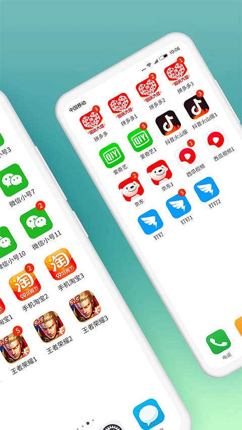 - 提供分身独立桌面(如快手、京东、闲鱼),方便开启大小号,开启微信多开消息通知,重要消息不错过,自定义分身图标、名称,随心定制分身APP,更好的保护隐私。