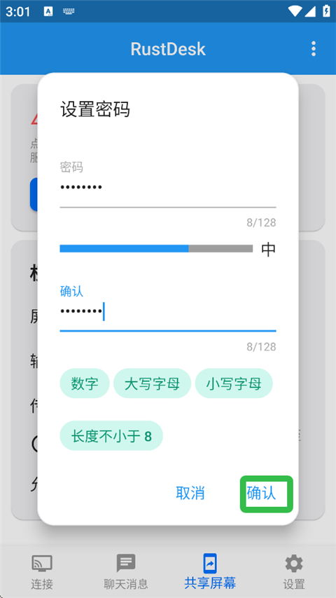 4、密码达到要求后,粉色信息变为绿色,点击【确认】即可。