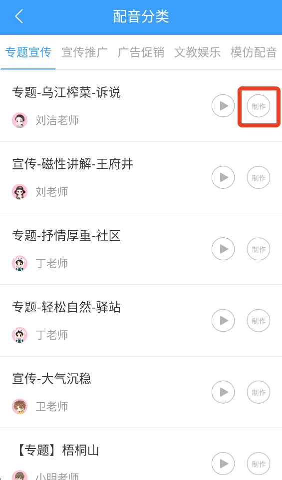 2、大家可以听一些老师的音频,找到自己喜欢的风格就点击右边的制作按钮。