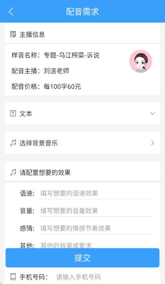 4、填入一些你想要的音频效果、背景音乐等信息,点击提交,之后联系客服就可以了。