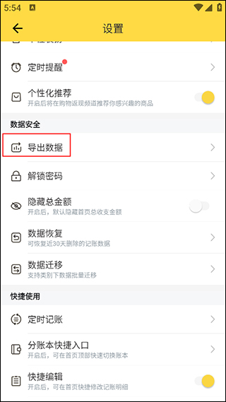 2、进入到设置页面,向下滑动屏幕找到数据安全列表下的“导出数据”选项并点击进入;
