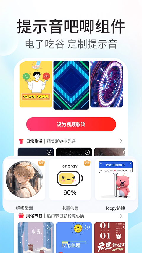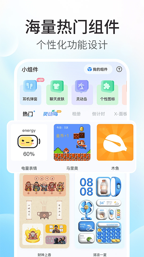 主题小组件美化软件是一款可以为用户提供各种类型的桌面小组件应用,在软件中拥有动画、电量表情、跑马灯等多种多样丰富有趣的小组件供你选择。不仅如此,用户还可以设置耳机弹窗,让用户在连接耳机之后可以弹出有趣的动画内容,而且还可以设置聊天皮肤,让用户可以自由的选择自己和朋友聊天的背景图标,让聊天界面不再单调。