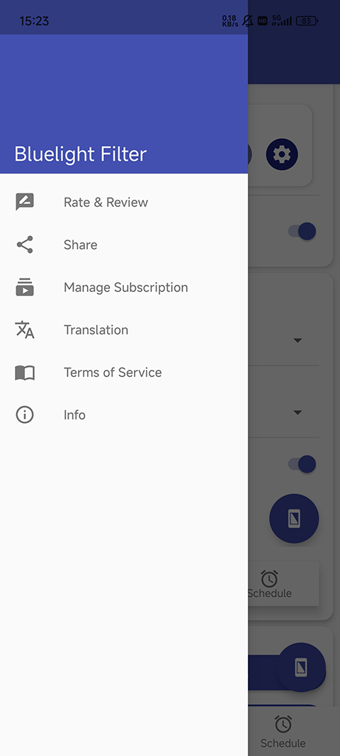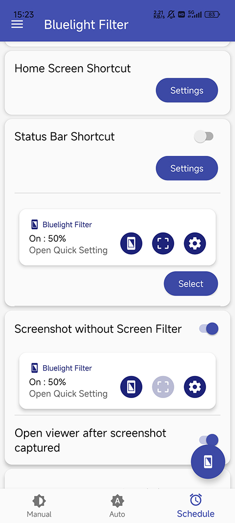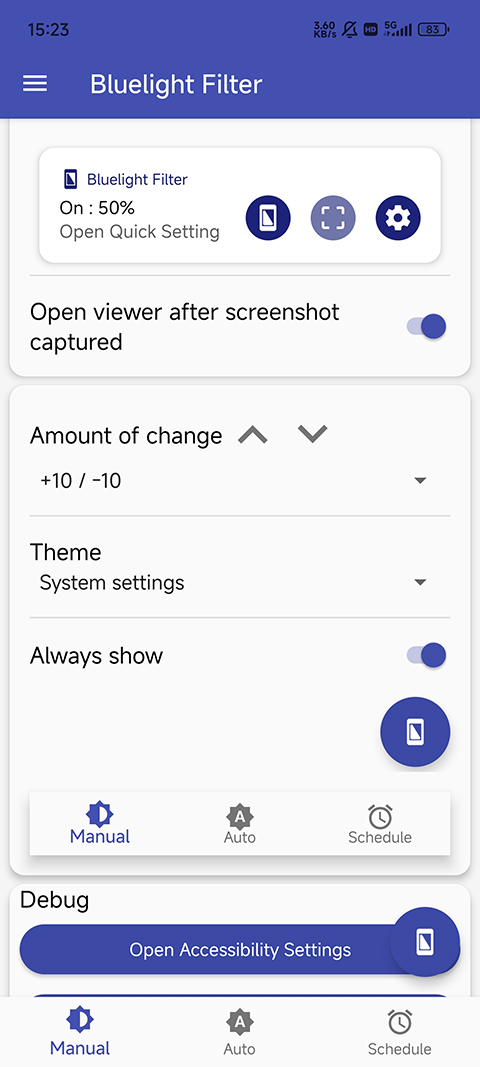 蓝色光波过滤器app可以非常方便的调节屏幕的颜色,开启颜色调节功能之后,可以非常有效果的减少蓝光的影响。蓝色光波过滤器app支持自动调节屏幕亮度,还可以支持自定义开启过滤,让你使用手机的时候眼睛不那么容易疲劳。