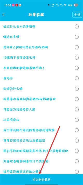 4、在批量选择界面勾选需收藏的语音,选完后点击底部添加到收藏夹按钮完成操作。
