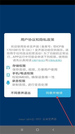 1、打开安卓变声器APP,进入时会弹出用户协议和隐私政策,阅读后点击同意并继续的按钮。