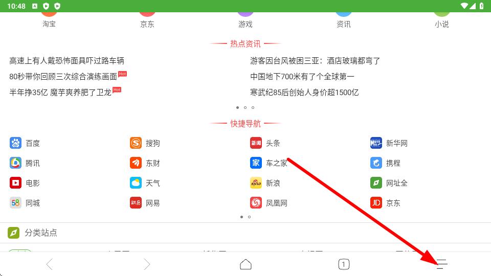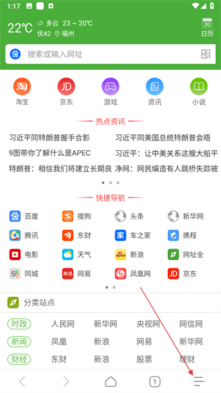 1、极速浏览器点击底部菜单栏最右侧的三横线按钮,打开功能菜单。