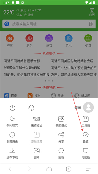 2、在功能选项列表里,找到设置按钮,点击该按钮进入浏览器的设置页面。
