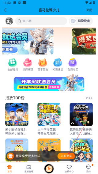 1、打开安全守护中的少儿板块,点击立即登录,跳转到喜马拉雅账号登录界面。