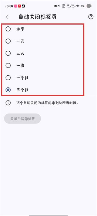 4、在自动关闭标签页界面里,选择所需的自动关闭时长选项,完成后即可生效设置。