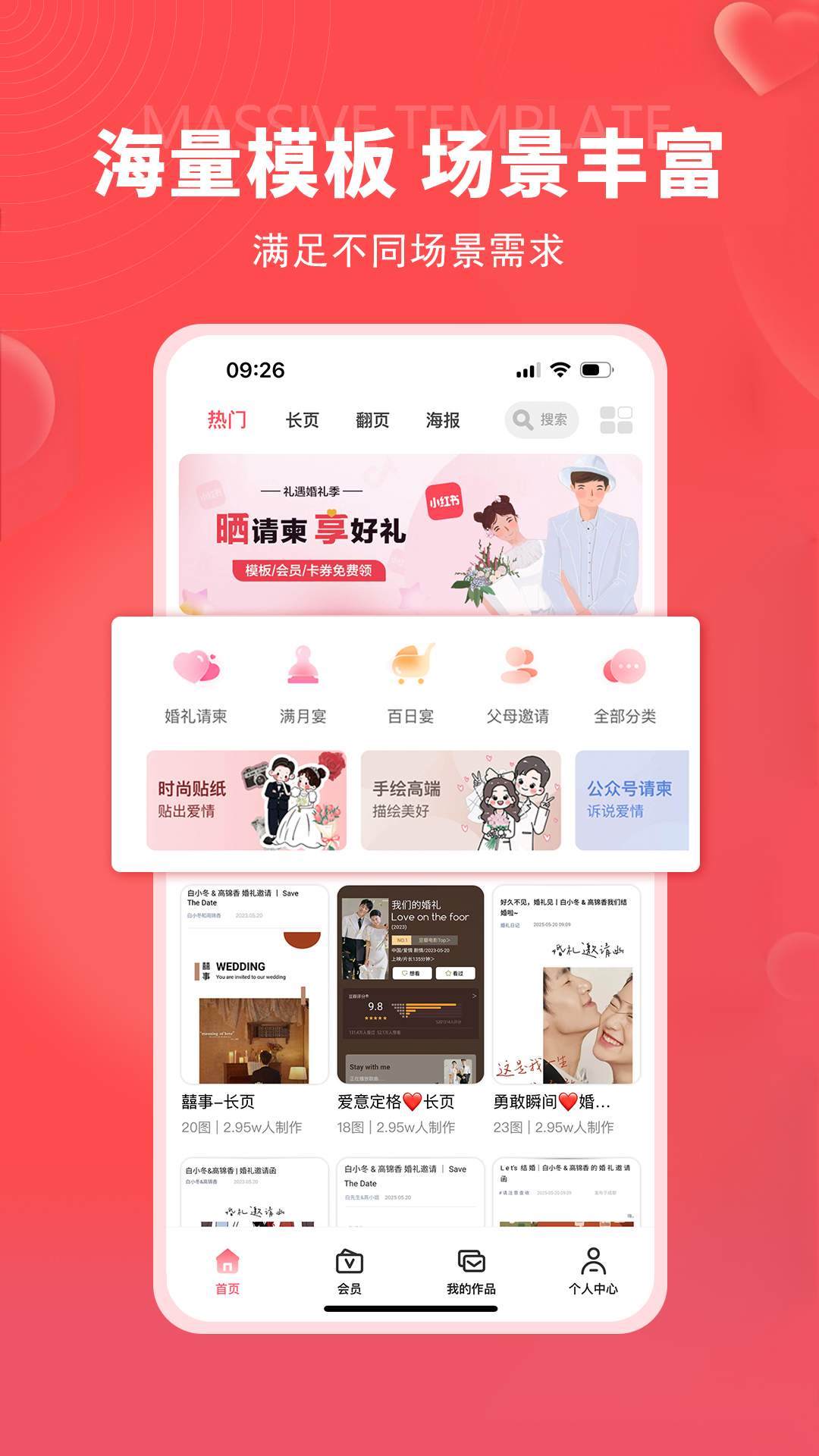 婚礼电子请柬、婚礼请帖、结婚请柬、宝宝满月、电子邀请函、电子请帖、喜帖、同学聚会、生日贺卡、老人寿宴、乔迁、婚礼纪念等海量APP模板。