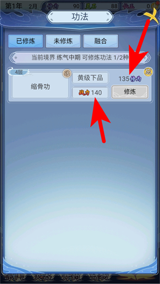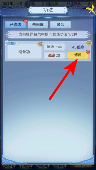3、在功法页面,点击修炼按钮,消耗修为提升功法等级。