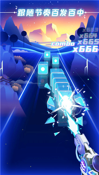 2、全新的背景音乐,丰富的关卡场景,跟随音乐的节奏来射击前面的障碍物;