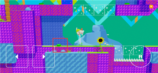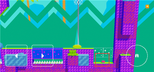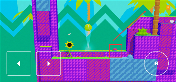 1、进入扣扣兽手机版第四关,向前跳,按一下地上的红色开关,弹射到上面平台。
