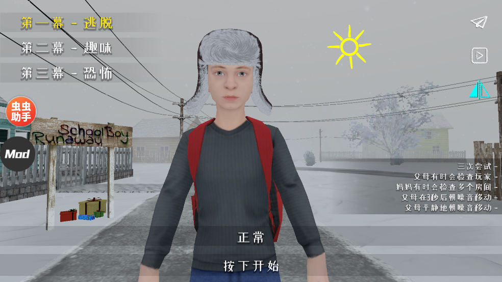 逃跑男孩游戏中文版(学生潜行逃亡)是一款沉浸式密室逃脱解谜冒险游戏。在游戏中你因不愿学习,而被父母软禁起来,需要利用自己的智慧来找寻线索,逃脱家门。试着比你的父母更聪明,并找到与你的朋友一起出去玩的方法。游戏操作简单直观,只要掌握角色的移动与闪避技巧,就能迅速融入游戏,享受流畅的操作体验。