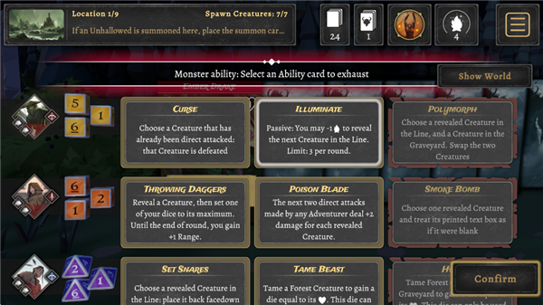 使用你的特殊技能与怪物战斗。直接用骰子攻击或激活正确的技能。每个法术的正确时机是生存的关键,因此谨慎使用你的选项,错误可能会让你输掉一局。