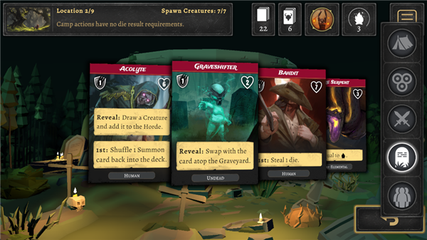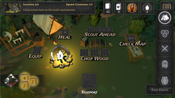 3、治疗、侦查牌堆、换装备、点火——光亮决定你能看多远,也影响敌人来袭的节奏。