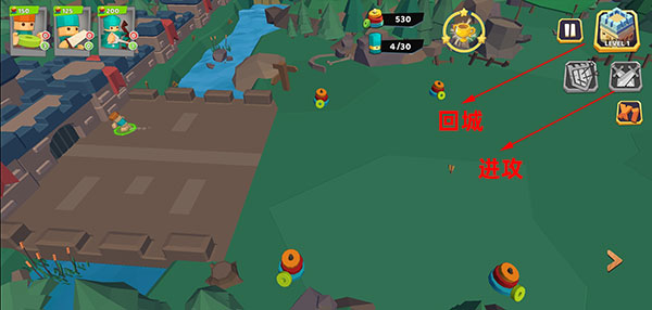 5、备战完毕后,点击左边的进攻按钮,如果地方火力太猛,可以选择回城进行防御。