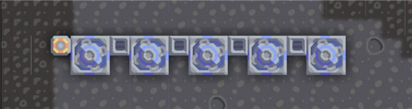 注意B不接受带输入,A也不接受桥下的带输入,所以在输出资源时,往往需要多安置一个传送桥单体,让最外面(上图为最上面的一排钻头,共四个)的钻头也能正常输出。