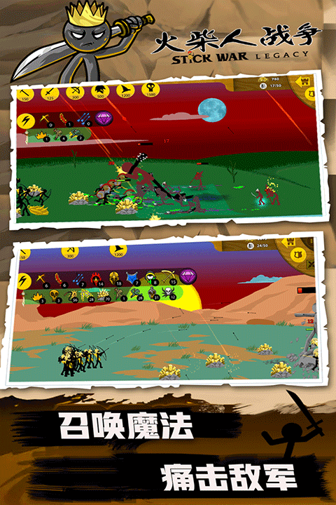 1、游戏中玩家可以亲临激烈刺激的战场,指挥你的火柴人勇士进行作战,而且游戏中有着各种火柴人士兵可供训练。
