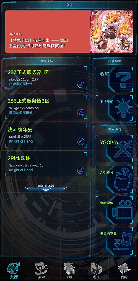6、配备卡牌资料查询、卡牌组编辑功能、基础ygopro原创战端游戏视频组卡功能,并可连接局域网(面对面)。