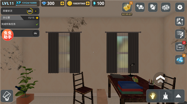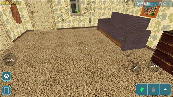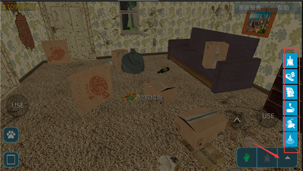 2、成功进入房间,点击右下角的这个图标可以使用道具来打扫垃圾;
