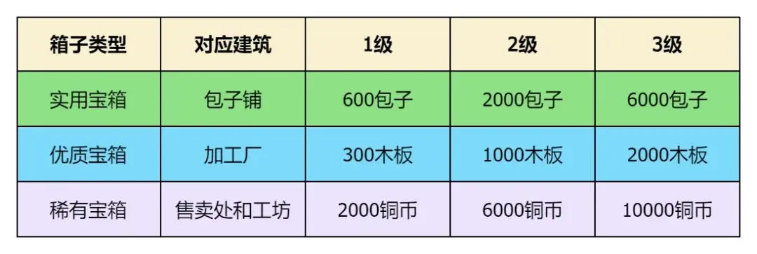 4、开启绿/蓝/紫箱子所获得的资源与对应的建筑有关,因此飞升大世界后,要优先升级系统等级到13级解锁中级建造术,就能将包子铺、加工厂、售卖处/工坊的建筑等级拉满,开启宝箱的资源最大化。