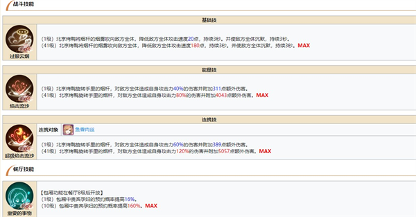 一技能增加友方一个单位的攻速,大招群体伤害但是有几率对自身造成伤害(攻击力90%)……我没用过,因为意外性太多,增加攻速的飨灵有比咖啡好的……不过他有可搭配的连携阵容