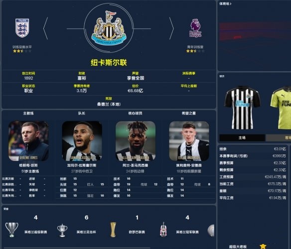 阵容方面,纽卡原班人马只能算是英超中下游水平,即便有着圣马克西曼和卡勒姆这样的锋线,但也掩盖不了整体实力不太行的缺点。不过手握2.3亿转会预算、70W的剩余工资额度,可以来一波大换血。