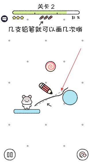 2、用铅笔绘制曲线连接仓鼠与蓝色圆球,消耗铅笔次数,推进关卡进度。