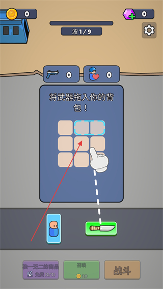 1、按照提示将武器拖入背包,完成背包的装备配置,准备进入战斗。
