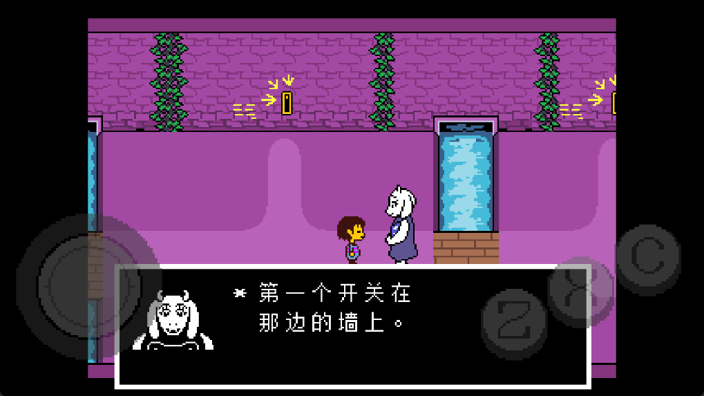 6、随后进入到东西向并且有两条小溪长廊上,Toriel需要你去拉下墙上有标记的杆子,一共需要拉下两个,那么东面的尖刺陷阱就会被移除。