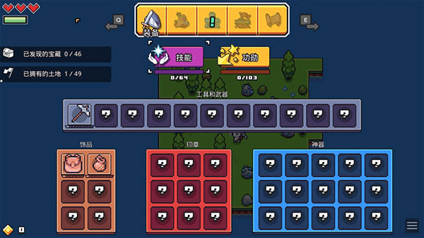 点击菜单栏中的“装备”按钮,可打开装备界面,此处将展示已经解锁的工具、武器、饰品、印章及神器