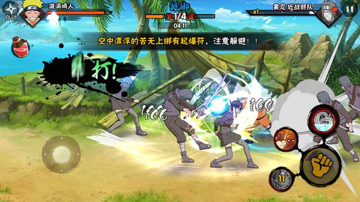 传说忍者任你驱遣操作,木叶十二小强、指导上忍、传说三忍、砂之国忍者……告别单一角色体验,任意切换,肆意挥洒!