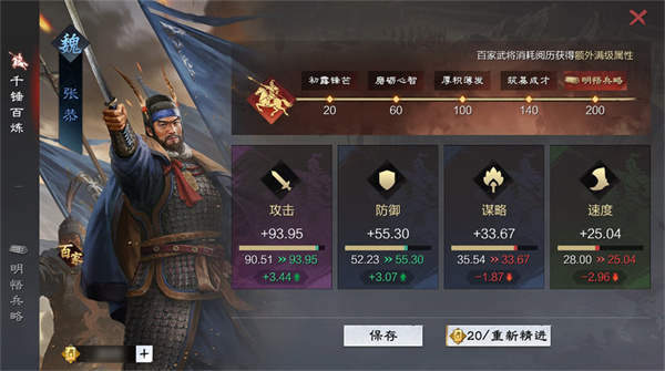此外,百家武将的属性还可以通过消耗“属性阅历”来对其属性进行精进。每一次精进后,百家武将的属性都会有一定的变化,主公可以选择保存心仪的精进结果;或者舍弃不想要的精进结果,开启新一轮的精进。
