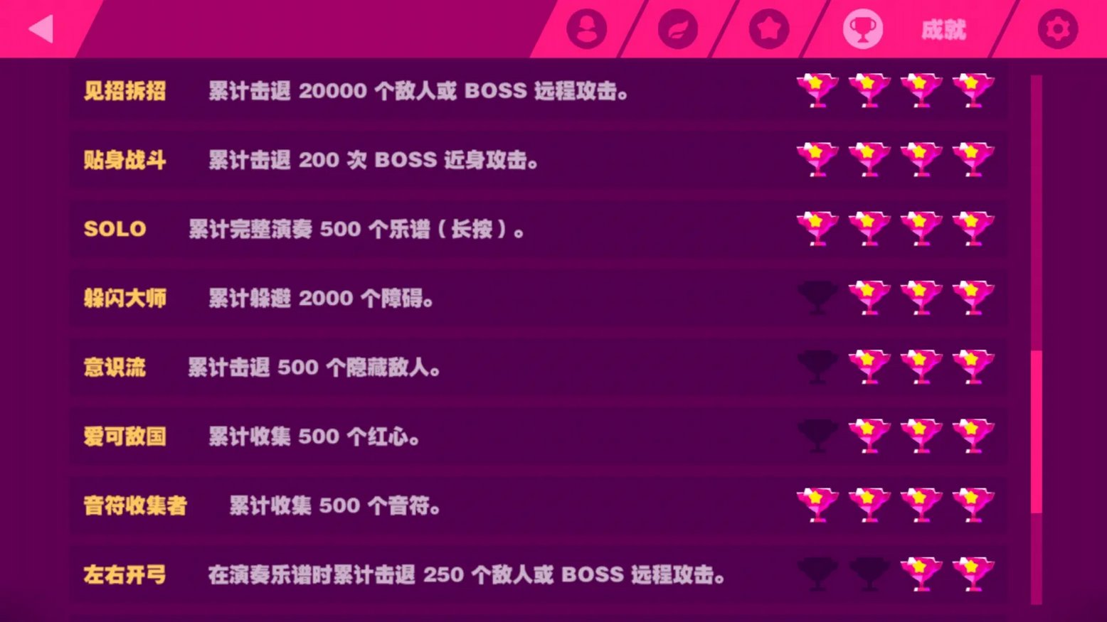 奖杯的达成要求有很多种,比如Miss判定连击数总分数完美打击开启Fever状态次数等等。