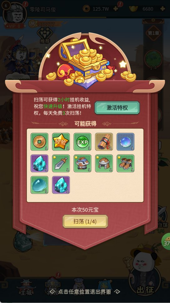 消耗少量元宝扫荡,直接获取 2 小时挂机收益 + 装备 / 材料,高效积累资源。