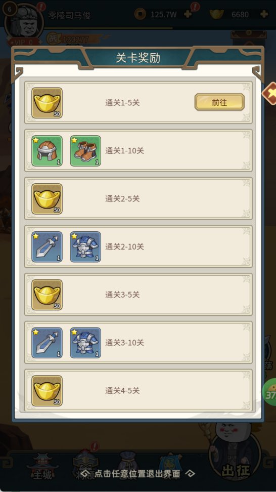 通关指定关卡可领取元宝、装备,推图同时顺手拿物资。