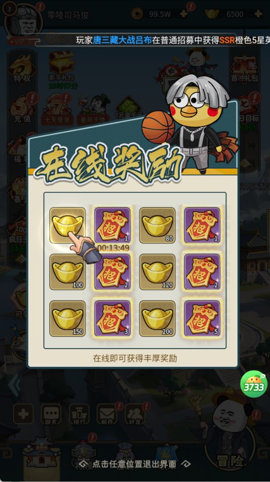 保持在线即可定时领取元宝、招募券,零成本积累核心道具。