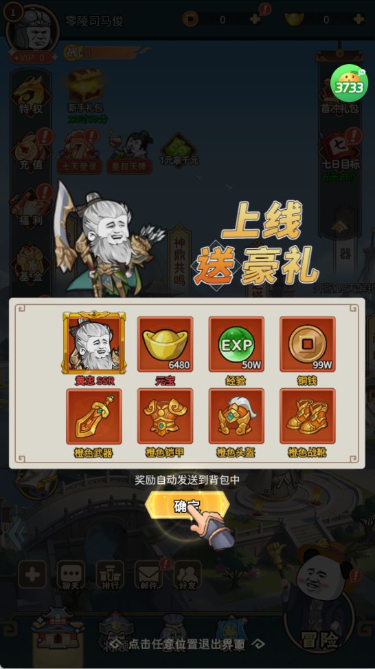 1、创角就送SSR黄忠+6480元宝+一套橙装+50w经验+50w铜钱