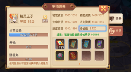 宠物培养分为喂养和资质两个方面。喂养是可以提升宠物的极限上限值的,而资质是用来提升当前资质条的。