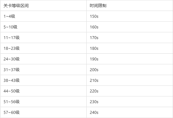 不同关卡等级对应时间不同,详情概览表: