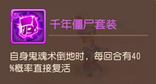 千年僵尸的专属套装能够让拥有鬼魂/高级鬼魂的僵尸倒地后每一回合均有40%概率直接复活。