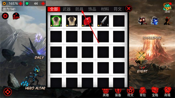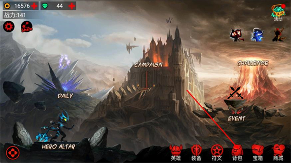 1、在火柴人联盟主界面,点击底部的背包,进入背包页面。